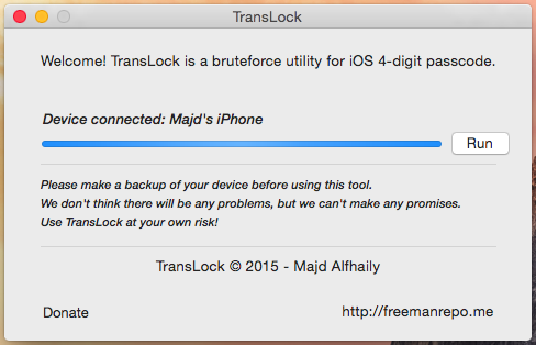 - (BOOL)isBlocked;I hooked those class methods to return a value of false. When I proceeded to run the code again, the device no longer disables passcode entry after 10 failed attempts. The code is now able to try a 4-digit passcode combination every 5 seconds. This translates to a max runtime of 14 hours for every single pin combination possible.